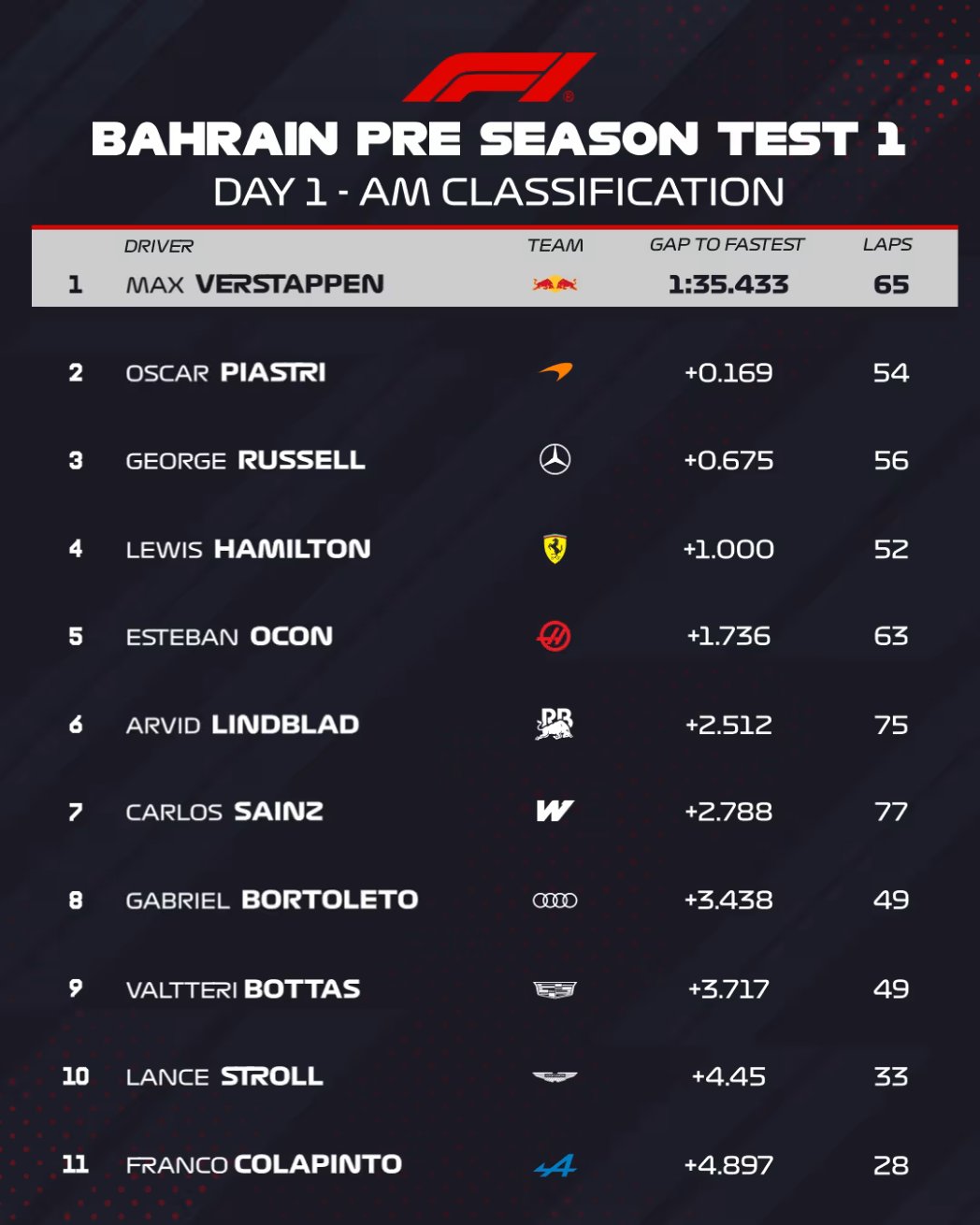Max Verstappen je postavio najbrže vrijeme prvog dana testa u jutatnjem dijelu sesije u Bahreinu. Vozač Red Bulla je zabilježio 1.35. 433 vrijeme na medium gumama. Iza njega se smjestio Oscar Piastri sa zaostatkom od 0.169 sekundi. Treće mjesto je pripalo Georgeu Russellu, koji je imao vrijeme 0.675 sporije.