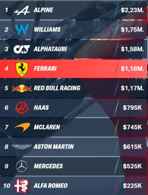 Ovaj popis prati i vozače i timove koji su potrošili najviše novca na štete prilikom u dosadašnjem dijelu tekuće sezone.