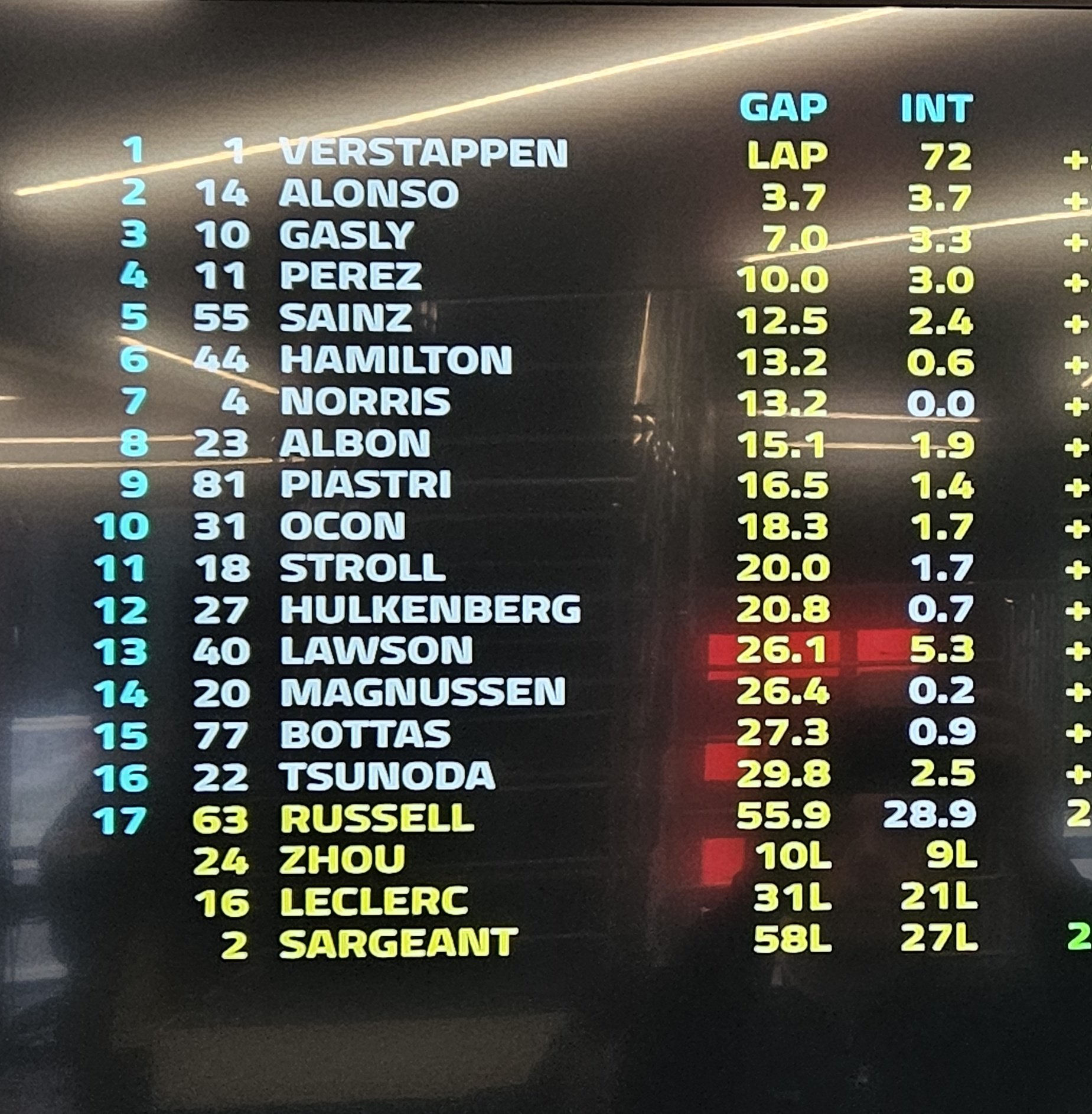 Poredak nakon 65. kruga: Verstappen, Alonso, Gasly, Sainz, Hamilton, Perez, Norris, Russell, Albon, Piastri.